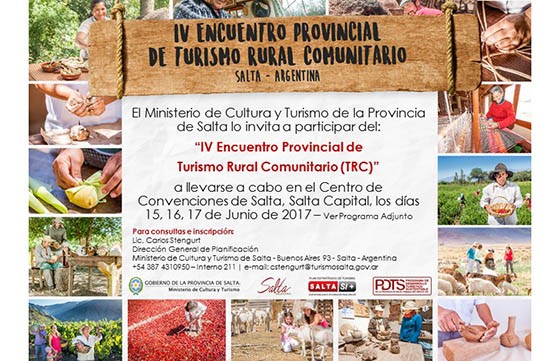 El Cuarto Encuentro Provincial de Turismo Rural Comunitario, organizado por el Ministerio de Cultura y Turismo de la Provincia, se realizará desde hoy y hasta el 17 de junio en el Centro de Convenciones Salta. El acto de apertura se realizará a las 11:30.