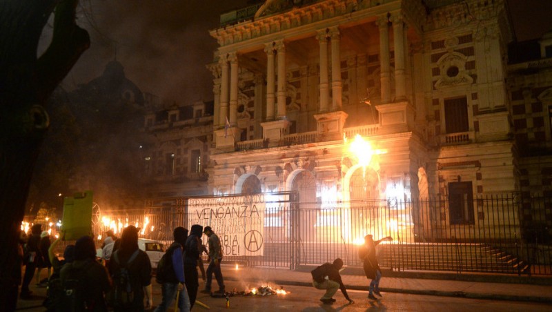 En menos de una hora de aquella noche, algunos integrantes de la marcha por Santiago Maldonado, desaparecido desde el 1 de agosto en Chubut, apedrearon la Casa de Gobierno bonaerense, provocaron rotura de vidrios y destrozos en el despacho del jefe de Gabinete, Federico Salvai e intentaron incendiar parte de la fachada del edificio. Luego, se trasladaron cien metros hasta el Banco Galicia para continuar con los destrozos, y en la esquina de la entidad financiera, donde funciona el Anexo del Senado –en el ex Banco Hipotecario- arrojaron una bomba molotov que hizo combustión en subsuelo quemando muebles y mampostería.