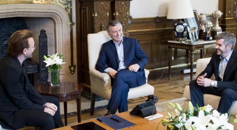 El presidente Mauricio Macri recibió hoy a Bono, líder de la banda irlandesa U2 que se destaca por su compromiso social en una audiencia privada que se extendió por espacio de una hora y en la cual dialogaron sobre la importancia de llevar la educación a los sectores más vulnerables en distintas regiones del mundo.