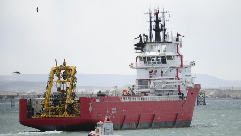Imagen portada:Partida. El Sophie Siem, poco después del mediodía, cuando partió del puerto de Comodoro Rivadavia rumbo al área de búsqueda, 430 km del mar