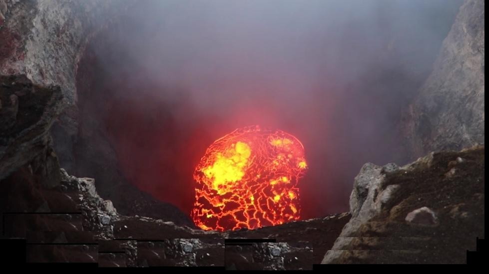 En el fondo del cráter principal, a unos 200 metros de la cima, un lago de lava incandescente borbotea por la acción de los gases del interior y la caída de rocas de las paredes interiores de la montaña.