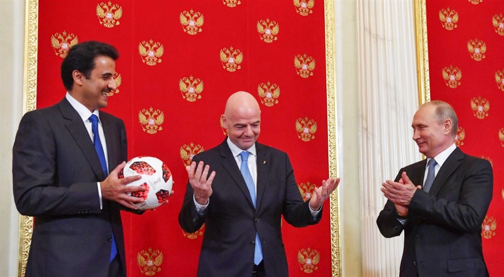 El emir Sheikh Tamim bin Hamad al-Thani, Gianni Infantino y Vladimir Putin, en un encuentro el último fin de semana en el Kremlin
