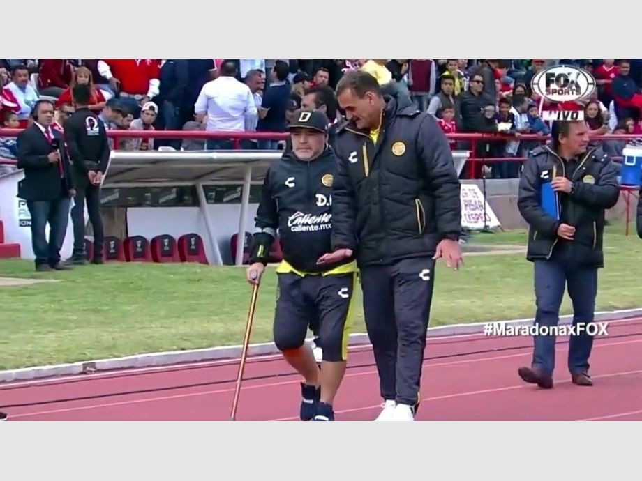 Este sábado, salieron a la luz nuevas imágenes que preocupan. Maradona salió a dirigir el partido de los Dorados de Sinaloa ante los Mineros de Zacatecas con un bastón en su mano derecha, mientras que del otro costado lo acompañó su auxiliar Luis Islas.