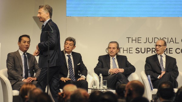 El presidente Mauricio Macri saludó en la apertura del j20 a miembros de la Corte Suprema: Rosenkrantz, Rosatti, Highton, Lorenzetti y Maqueda.Foto:Archivo