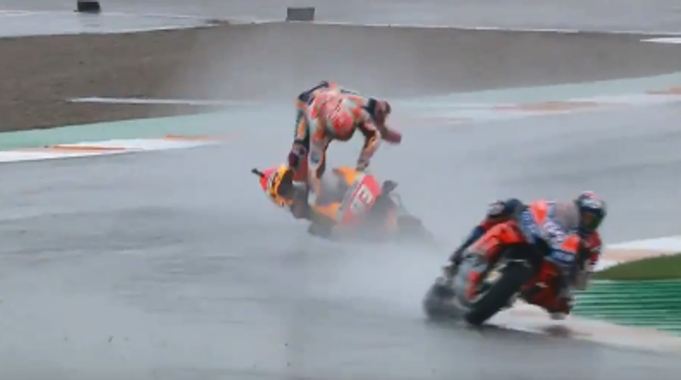 Marc Márquez llegaba al Gran Premio de Valencia con el título bajo el brazo pero ni así se conformó en la última carrera del año, pasada por agua. El de Cervera estuvo luchando por la victoria pero de tanto arriesgar acabó por los suelos, con una espectacular caída en la que se dislocó nuevamente el hombro como en los entrenamientos.