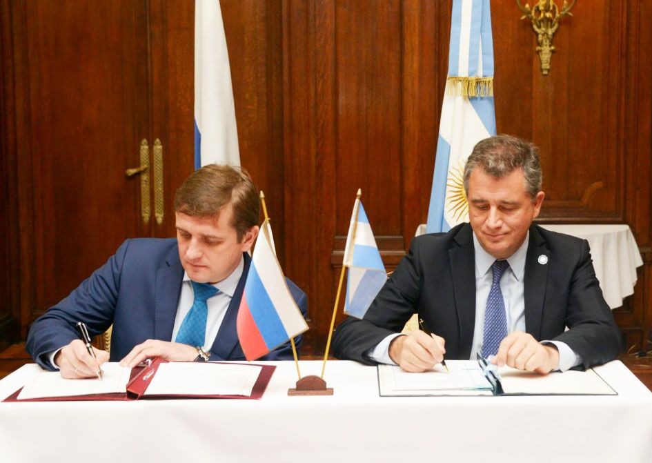 Etchevehere firmando convenio con el viceministro ruso de Agricultura, Ilka Shestakov. Foto: Presidencia