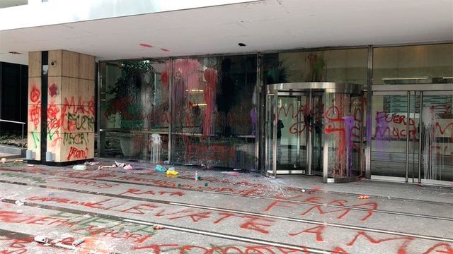 El ataque fue atribuido al Frente de la Organización en Lucha (FOL) que dejó pintadas contra el mandatario argentino: "Fuera Mauricio Macri"