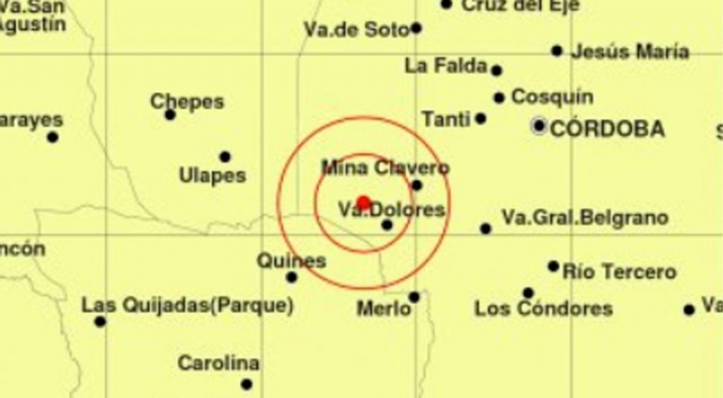 Epicentro: 119 km al SO de Córdoba; 188 km al NE de San Luis; 19 km al NO de Va.Dolores -31.826 (lat) -65.341 (long)