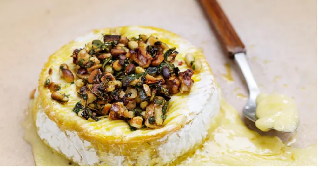 Poner la mezcla de frutos secos encima del queso y hornear 10 minutos o hasta que el queso esté caliente y suave y los frutos secos estén tostados. Servir caliente o esperar que se enfríe un poco.