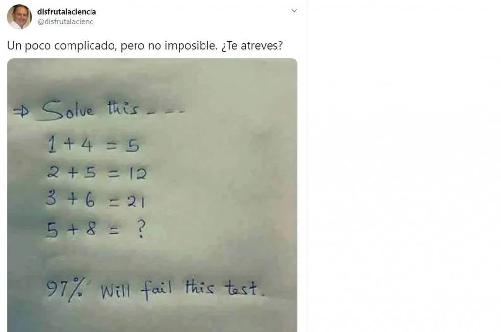 "1+4=5; 2+5=12; 3+6= 21; 5+8= ?", parece fácil pero no lo es. Es por eso que ese acertijo matemático enloqueció a muchos usuarios de las redes sociales que no podían entender cómo el resultado no es 34. Encima el que lo presentó en Twitter es un especialista que puede resolver sin problemas ecuaciones de alta complejidad. ¿Entonces cuál es la respuesta para esta cuenta?