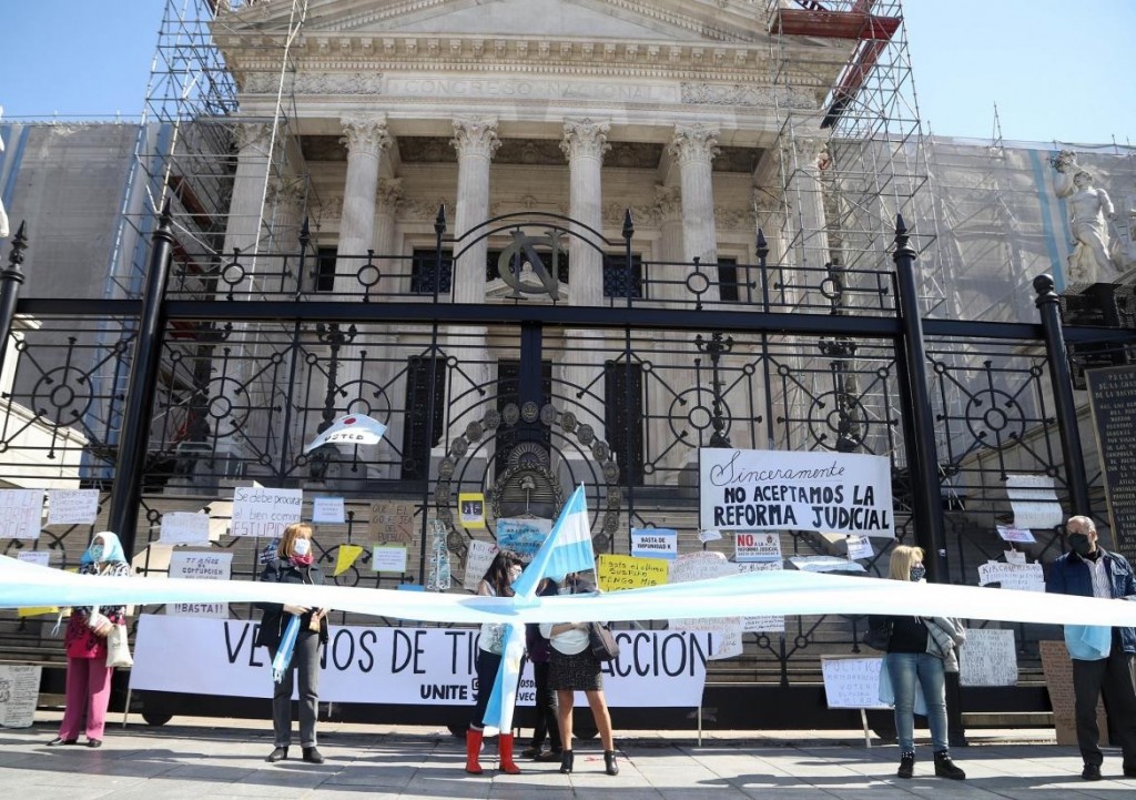 Un nutrido grupo de manifestantes se concentraba esta tarde en las inmediaciones del Congreso con banderas argentinas para rechazar el proyecto de reforma judicial que se discute en la Cámara de Senadores.