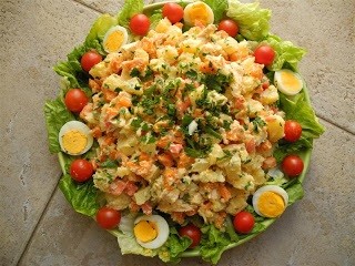 6. Paso 6: Se coloca en una taza las papas, el pollo, los huevos duros cortados en cuadros, los tomates en gajos, las tiritas de pimientos, la cebolla y la lechuga bien cortada.