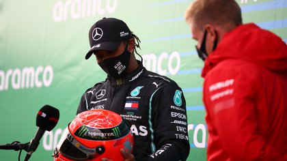 Lewis Hamilton recién había logrado alcanzar la 91ª victoria de su historia deportiva en la Fórmula 1 y daba sus primeras reacciones cuando irrumpió en medio de la entrevista Mick Schumacher. Con un casco de su padre en la mano, felicitó al británico y le regaló el preciado objeto como reconocimiento por haber alcanzar la emblemática marca que logró el piloto alemán durante su trayectoria en la F1.