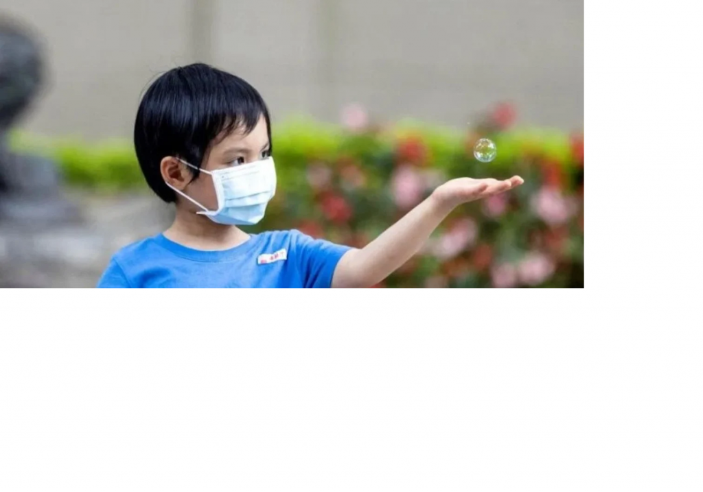 Un niño juega en China mientras lleva puesta una mascarilla.