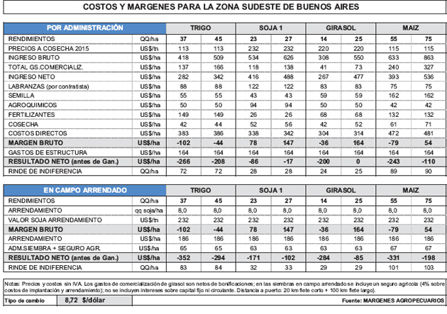 A continuación se muestra la proyección de resultados para la zona Sudeste de Buenos Aires sobre la base de los precios estimados a cosecha 2015 para trigo y granos gruesos.