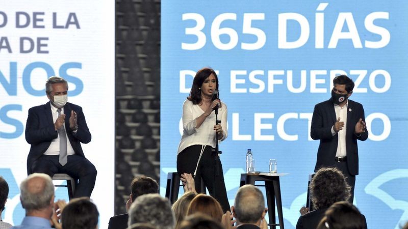 Así habló Cristina el viernes en un acto del Frente de Todos en el Estadio Único de La Plata, organizado por Axel Kicillof. En el escenario estaban Fernández, Sergio Massa, Máximo Kirchner, Kicillof y la vicegobernadora Verónica Magario.