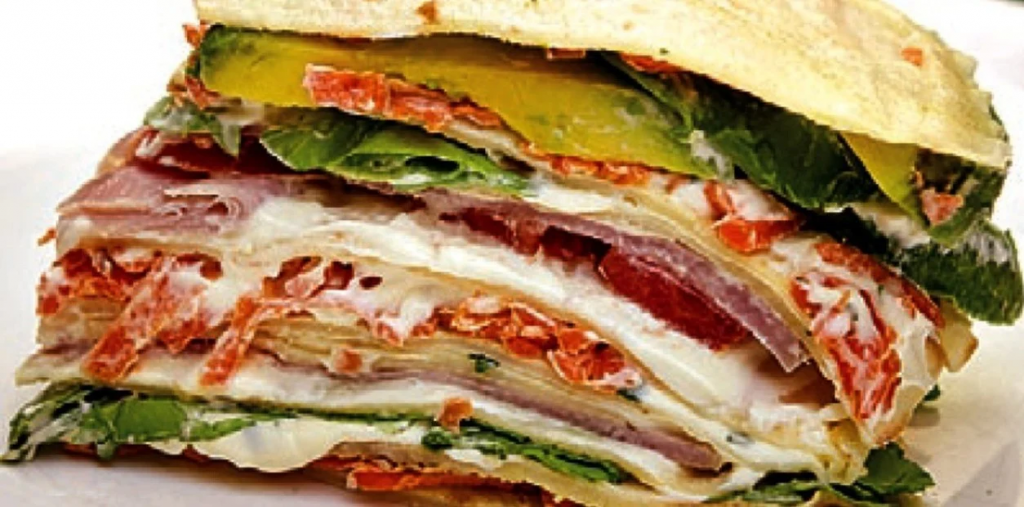 El armado. Mezclar el queso crema con la mayonesa y condimentar con sal, pimienta negra y ajo. Untar 6 panqueques. Cubrir con capas de cada vegetal y al menos 2 que tengas jamón y queso. Armar la torre 30 minutos de comerla y llevarla a la heladera para que quede bien firme y se pueda cortar.