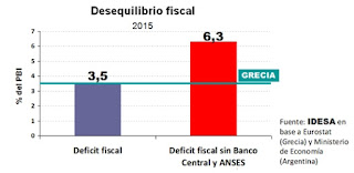 Estos datos muestran que el déficit fiscal en Argentina tiene aproximadamente el mismo nivel que en Grecia. Pero si se excluyen de los ingresos las transferencias al Tesoro del Banco Central, ANSES y otros organismos públicos, el desequilibrio fiscal en la Argentina casi duplica al que registra Grecia.